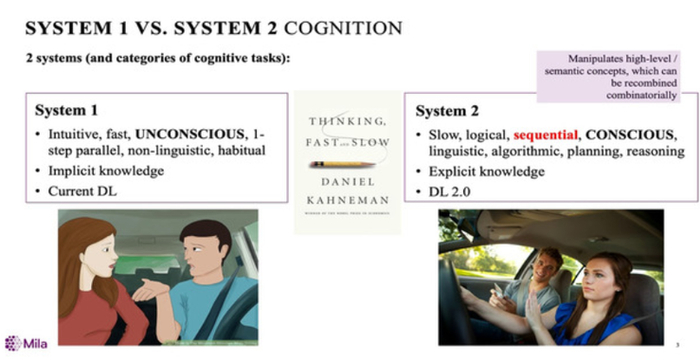 Bengio在其报告《与意识相关的深度学习先验》中提到,丹尼尔·卡尼曼的书《思考,快与慢》中指出人的认知系统有两类,一类是无意识(快系统)的,关键词是直觉、非语言、习惯;第二类是有意识的(慢系统),关键词是语言性、算法性,推理和计划。