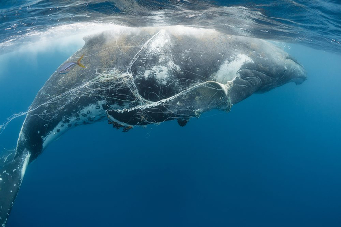 这只座头鲸被延绳钓渔具缠住,严重影响了它的游动能力。图片版权© Tony Wu