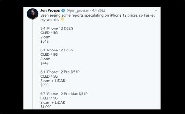 好消息是,此前神预言iPhone SE价格的博主Jon Prosser在推特上曝光了iPhone 12起售价,649美元(约合人民币4582元),比iPhone11还要便宜300多块。