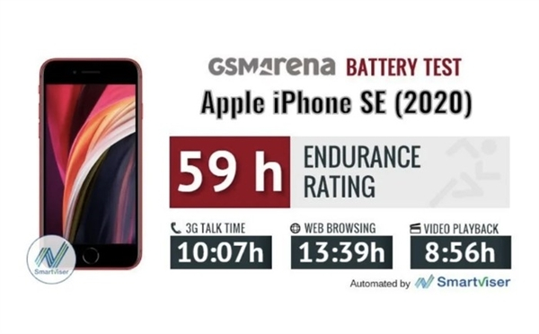 从GSMARENA的具体测试结果来看,iPhone SE在3G通话、网页浏览和视频播放使用场景下分别能坚持10小时、13.5小时和接近9小时,续航总成绩为59小时。