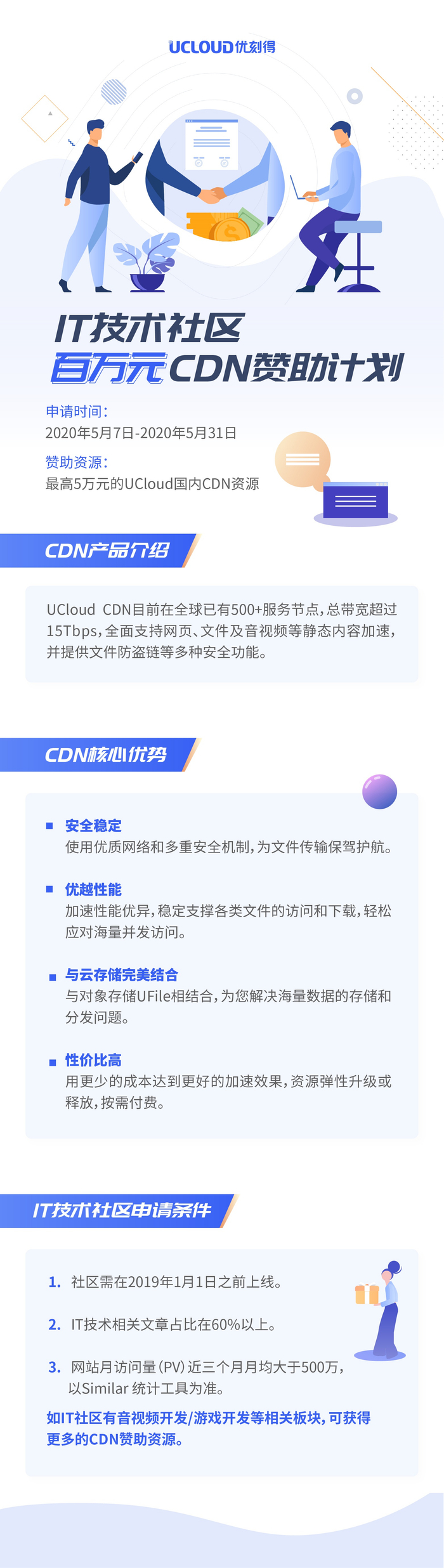 在此次UCDN资源赞助计划中,申请赞助的技术社区需在2019年1月1日之前上线,社区内IT技术相关文章占比在60%以上,同时网站月访问量近三个月月均大于500万,只需满足以上三项条件,即有机会获得最高5万元的CDN赞助金额,我们欢迎广大技术社区进行申领使用,更多活动细节可登录UCloud优刻得官网进行了解。