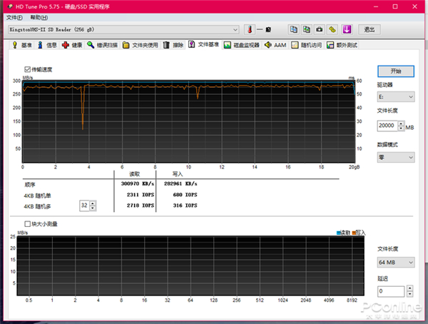 来到HD Tune Pro下的文件基准测试,该模式下分别通过真实写入文件后再读取文件的方式进行测试,可以测试出存储卡的极限读写速度。