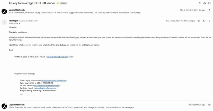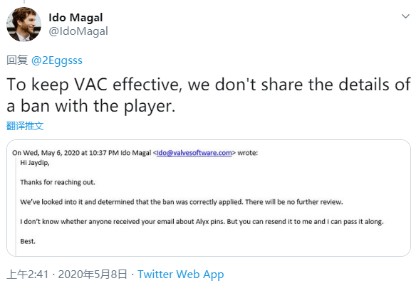具体来说2Eggs在自己的Steam主页和推特,甚至他人沟通中,都谎称自己被误封,并且发表了经过篡改PS的客服问答邮件。在2Eggs提供的截图中官方称他可能由于运行调试程序而被封,但是在V社开发者Ido Magal提供的真实邮件中,只有官方确认其作弊的信息。