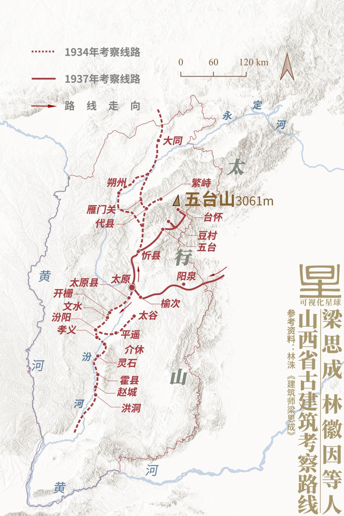 ▽1934、1937年梁思成与林徽因、莫宗江、纪玉堂在山西省考察路线| 制图@陈志浩&张靖/可视化星球
