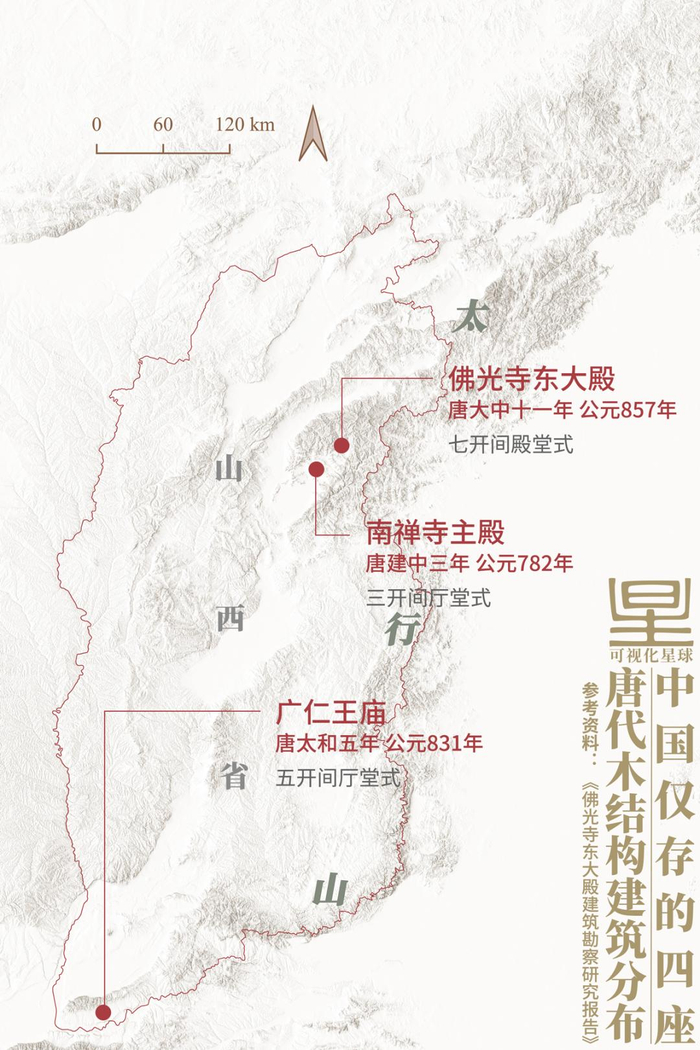 ▽学界较认同的中国仅存三座唐代木结构建筑:佛光寺/南禅寺/广仁王庙,均位于山西省,注:天台庵已被证实为五代建筑| 制图@陈志浩&张靖/可视化星球