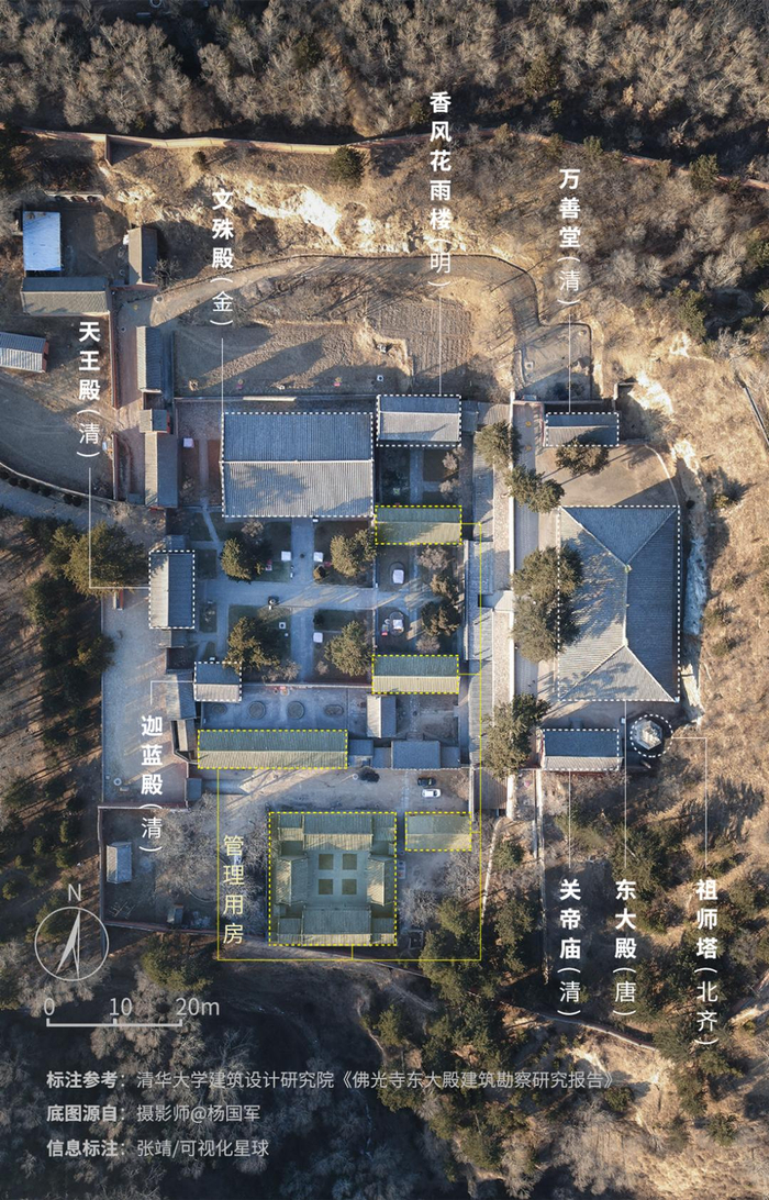 ▽佛光寺建筑布局图解| 摄影师@杨国军,标注@张靖/可视化星球