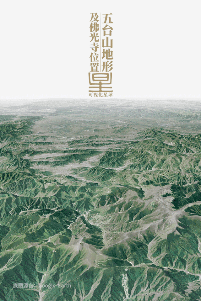 ▽五台山地形及佛光寺位置图,五台山由五座山峰合围起来的盆地而得名,五峰之内称“台内”,五峰之外称“台外”| 制图@张靖/可视化星球