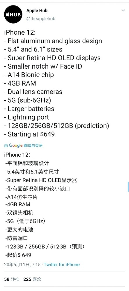 根据推特爆料,iPhone 12系列搭载最新的A14处理器,众所周知,每次新发布的iPhone都会搭载新一代处理器,相比前代都会拥有更快的处理速度和更低的功耗,相信新一代的A14处理器同样如此,值得期待。并且iPhone 12系列电池容量比iPhone 11系列更大,配备双摄像头,拥有4GB RAM,iPhone 12和iPhone 12 Max的屏幕尺寸分别为5.4英寸和6.1英寸,起价649美元(约合4596元人民币)。除此之外,iPhone 12系列也是首款支持5G的iPhone系列。
