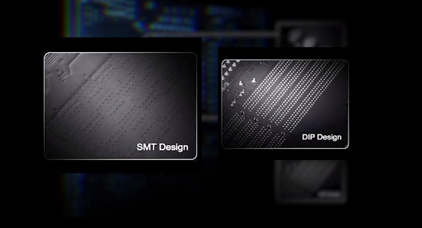 另一方面,技嘉还升级了内存插槽的封装模式。我们知道,传统的内存插槽采用了DIP(双列直插式封装技术),在主板的背面会看到两排金属引脚。这些阵脚由于是金属材质,非常容易接收到其他电子元件运作时所产生的杂讯,进而造成内存的运作不稳定。