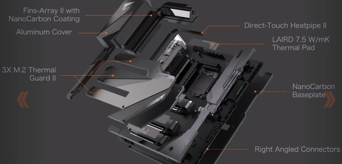 除了电源之外,良好的散热也是系统稳定运行的关键,技嘉Z490主板进行了散热升级,采用了Fins Array II、Direct Touch II和纳米碳散热技术。