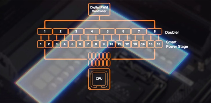 技嘉AORUS主板采用了数字CPU供电设计,通过大功率供电晶体管,为单项供电提供90A的供电效果,整体最高可以产生1440A的供电能力。