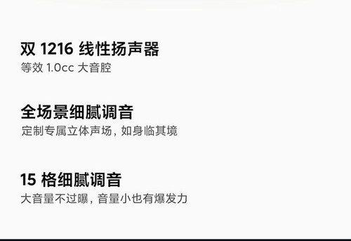 多媒体技术 | 双1216线性扬声器,等效1.0cc×2大音腔,X轴横向线性马达,Hi-Res认证,HEIF图片格式,双Smart PA大音量外放 |