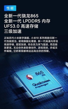 小米10搭载高通骁龙 865 旗舰平台,支持 SA、NSA 双模 5G,全系标配 WiFi6,全系标配 LPDDR5 内存及 UFS3.0 闪存,顺序写入速度最高 730MB/s;电池容量达到了 4780mAh,支持 30W 有线/无线闪充和 10W 无线反向充电。散热采用 3000mm2VC + 多层石墨 + 石墨烯矩阵式温度传感器 + AI 学习温控策略。