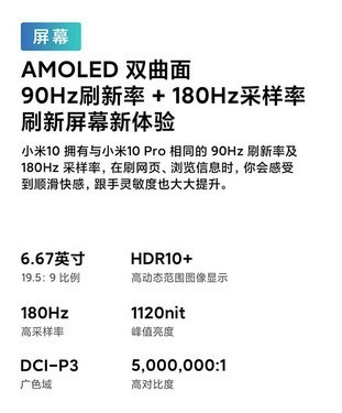 (中关村在线 西安行情)小米10采用 1.74mm 小孔径挖孔屏方案,定制 AMOLED 曲面屏,对比度 5000000:1,峰值亮度达到了 1120 尼特、支持 HDR10+、支持 DC 调光与4096 级亮度调节,刷新率为 90Hz,采样率为 180Hz。扬声器方面采用对称对称式立体声,上下采用了完全一样的 1216 线性扬声器。钛银黑、蜜桃金、冰海蓝三款配色。近日小米10在商家“豌豆数码(全新原装)”热卖,现货促销,好物好价,值得您入手,[联系电话] 15109268755
