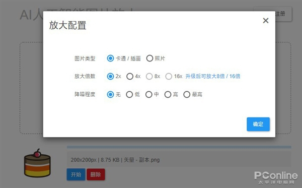 接下来是放大比率,免费用户可最大选择到4X,更大的就需要付费了。最后是降噪程度,即智能消除放大所产生的噪点与色斑。