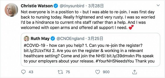 《护士的故事》作者克里斯蒂·沃森于3月28日在推特上表示重返NHS一线工作。