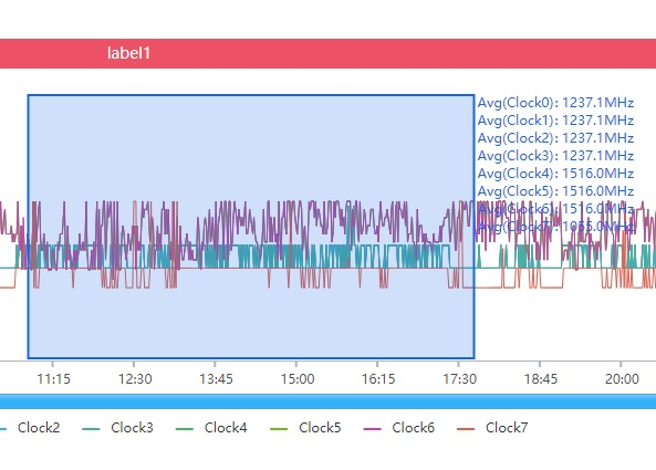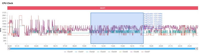 我们放大来看,后期游戏中,8枚核心基本保持稳定状态,四枚A55小核心平均帧率1.2Ghz,三枚A77大核心保持在1.5Ghz上下,最大的A77核心则在1GHz左右。