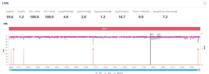 《和平精英》目前最高支持60FPS,在25分钟的游戏内,我们测得平均帧率为59.6。