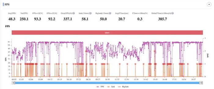 首先是《崩坏3》游戏,我们打开电池设置中的高性能模式,默认特效全开画质最高的情况下,运行崩坏3「后崩坏书」副本的剧情、委托任务20分钟后得到一张帧数表现图表,可以看到魅族17的平均帧数为48.3帧,其中剧情副本基本可以稳定在60帧左右,而委托任务的帧数波动幅度会大一些。