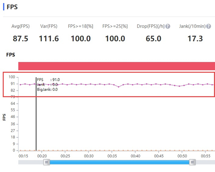 在该游戏中,我们测得平均帧率为87.5FPS(最高91FPS),如果局部放大,去掉死亡回放,只看游戏时帧率表现,可以看到魅族17基本全程稳定在90-91FPS,表现非常出色。