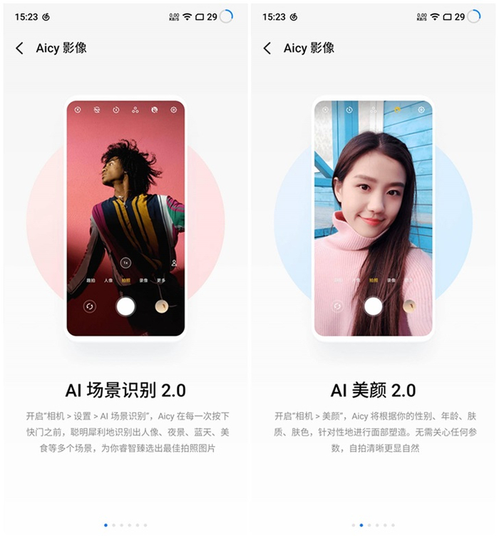 再比如Aicy还可在拍照中准确的识别出人像、夜景、蓝天,根据你的性别、年龄、肤质、肤色进行针对性的面部塑造和美颜。