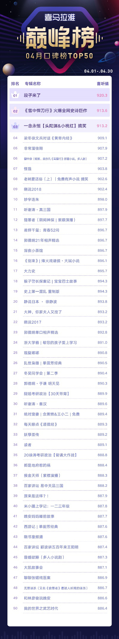 喜马拉雅巅峰榜4月榜单出炉,易烊千玺《青春52问》高分上榜口碑榜