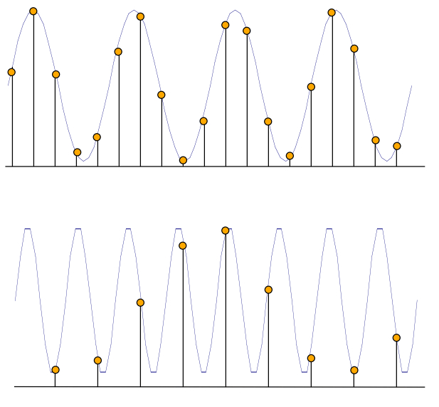 图 6:(上)样本足够快,重建信号和原始信号具备同样的频率;(下)样本太慢,以至于重建波形的频率比原始信号低很多。这就叫做锯齿。