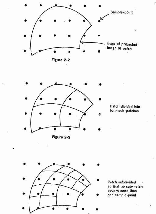 该论文的最后一项贡献就是支持抗锯齿的细分算法。细分算法分割 patch,直到每个子 patch 仅覆盖一个光栅元素。Catmull 修改了该算法,使之支持区域采样。请看以下示例: