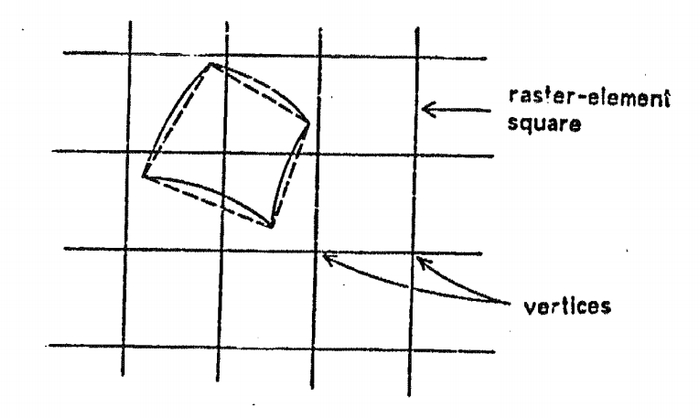 每个正方形表示一个光栅元素,横线与纵线的交叉点为顶点。Catmull 做出的修改是令每个子 patch 最多覆盖一个顶点。使用近似该 patch 的多边形(虚线)来执行区域计算。将该多边形分割为四部分,分别属于四个正方形。然后使用区域平均算法处理每个正方形,以计算新的像素值。