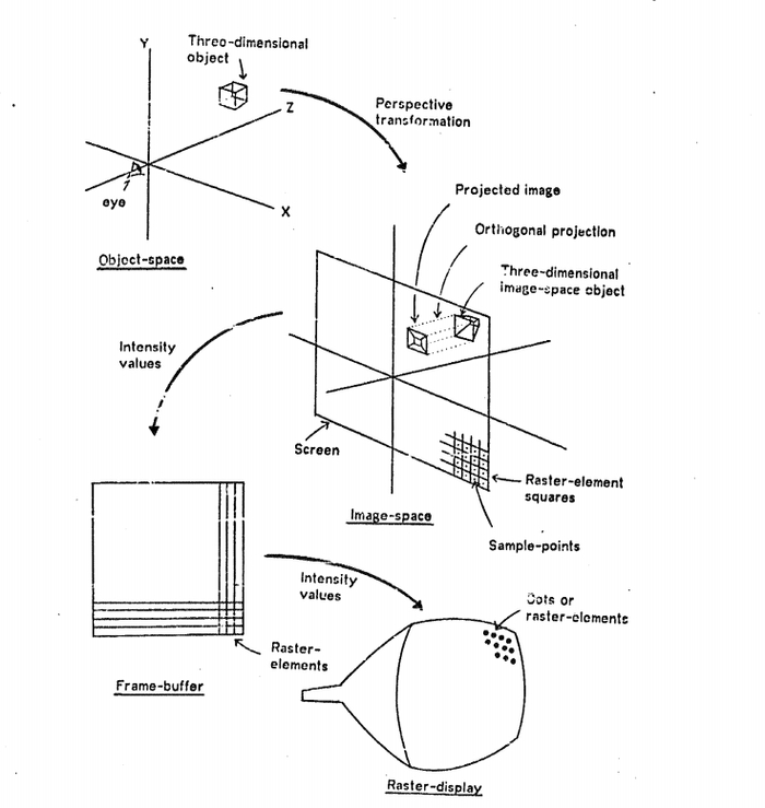 人们习惯在三维空间中观察和理解对象。而要想在二维平面上显示相同的对象,必须首先将三维对象进行透视变换(perspective transformation),这样我们才能把它理解为三维对象。我们将常规的三维空间叫做对象空间(object space),经过透视变换的空间叫做图像空间(image space)。图像空间也是一个三维的空间,但对象经过了扭曲,使得其在 x-y 平面上的正交投影可以产生预期的透视图。图像空间的维数保持为 3,以保存深度信息。图像空间在 x-y 平面上的投影被称为 “投影图像”(projected image),x-y 平面与光栅相关的部分称为 “屏幕”(screen)。