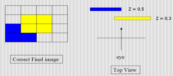 图 5:观察者在 z 轴负轴看向 z 轴正轴。深度越小的对象距离越近,并存储在最终 Z-buffer 中,然后显示在屏幕上。