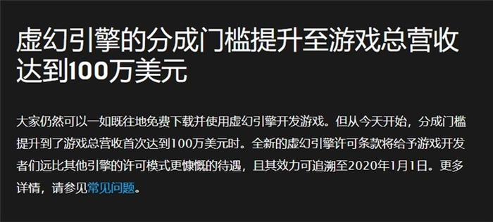 IT之家5月14日消息 Epic更新了虚幻引擎的抽成条款,大家仍可以免费下载和使用虚幻引擎,但从今日起引擎的抽成门槛提升至100万美元的游戏营收额。