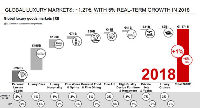 根据贝恩公司(Bain & Co.)联合意大利奢侈品协会(Fondazione Altagamma)发布《2018 贝恩公司年度奢侈品报告》全球奢侈品市场销售额(包含奢侈品和奢侈体验)在汇率恒定的情况下增长 5%,达到 1.2 万亿欧元(约为 9.19 万亿人民币)。