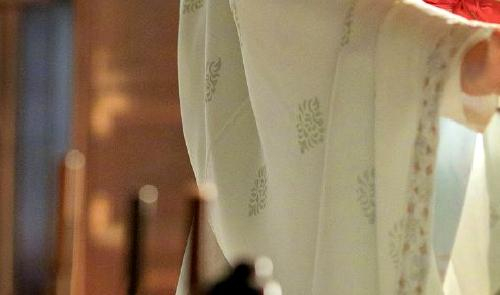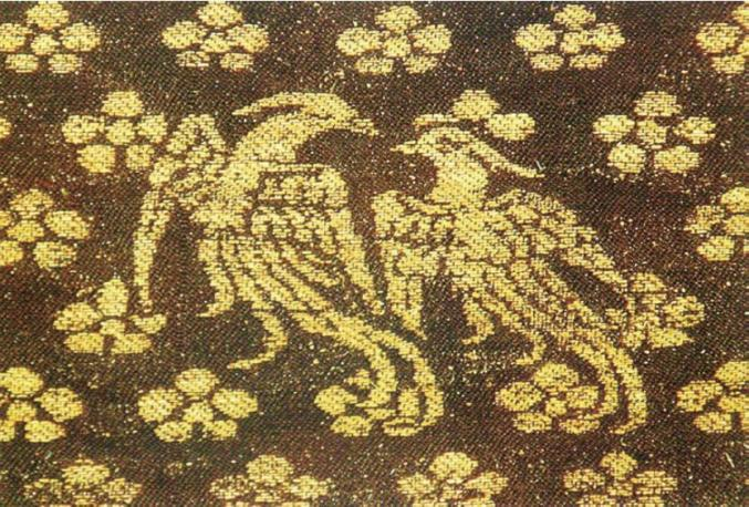 【朵梅双鸾纹织金绸绵护胸局部】