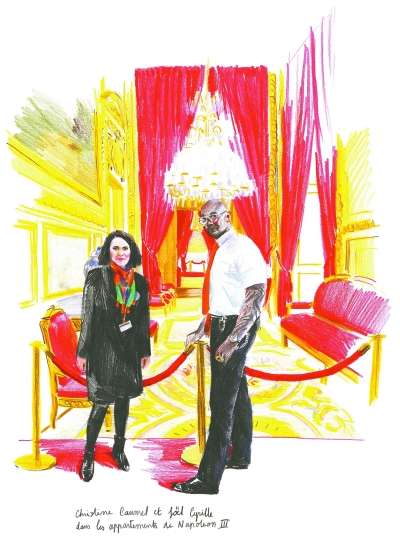 卢浮宫接待与监管处副主管克里斯蒂娜·科梅尔与干预组组长若埃尔·西里尔在拿破仑三世套房内。[法]露希尔·皮凯蒂 绘 选自《卢浮宫的幕布之后》