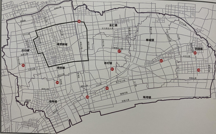 空间格局上,奉贤以“新城-奉城-海湾”三大组团为基础,构建“1+2+6+5”的城镇体系即1个新城+ 2个重点镇+ 6个一般镇及街道+ 5个集镇。