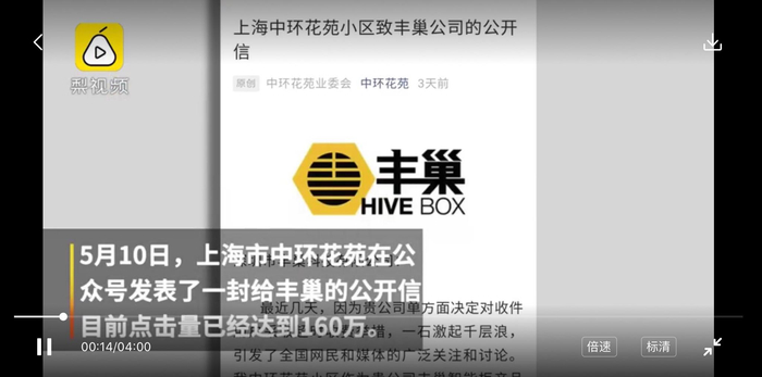上海中环花苑是上海第一个抵制丰巢收费的小区。10日,小区公众号发布致丰巢信,截至5月13日点击量超160万。