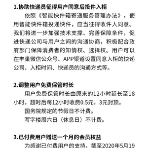 5月15日晚,距离宣布推出会员服务的半个月之后,丰巢致歉并调整服务,并提出了三点:1,协助快递员征得用户同意后投件入柜;2,调整用户免费保管时长;3,已付费用户赠送一个月的会员权益。此前,因调整智能快件箱免费保管期限和费用问题,丰巢与杭州、上海少数小区物业产生纠纷。