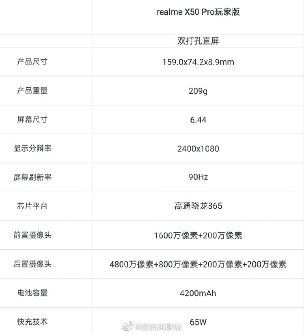 根据爆料,realme真我X50 Pro玩家版采用一块6.44英寸双打孔直面屏,分辨率为2400×1080,刷新率达到90Hz;机身尺寸为159.0×74.2×8.9mm,重量为209g;搭载高通骁龙865移动平台,支持双模5G网络;前置1600万像素+200万像素双摄像头,后置4800万像素+800万像素+200万像素+200万像素四摄像头;配备4200mAh电池,支持65W快速充电。