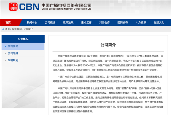 中国广电于2014年5月28日正式挂牌,注册资金45亿元(后来增至50.804亿),该公司的成立是由中央财政出资,由广电总局负责组建和代管,由广电总局和工信部按照职责对中国广电相关业务实行行业监管。