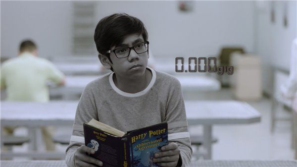 ▲一位生活在 2 Gig 区域的少年,手捧着一本只提供几页免费试读的《哈利波特》,最终因为说了一句话流量耗尽被冻结 | Amazon Prime Video