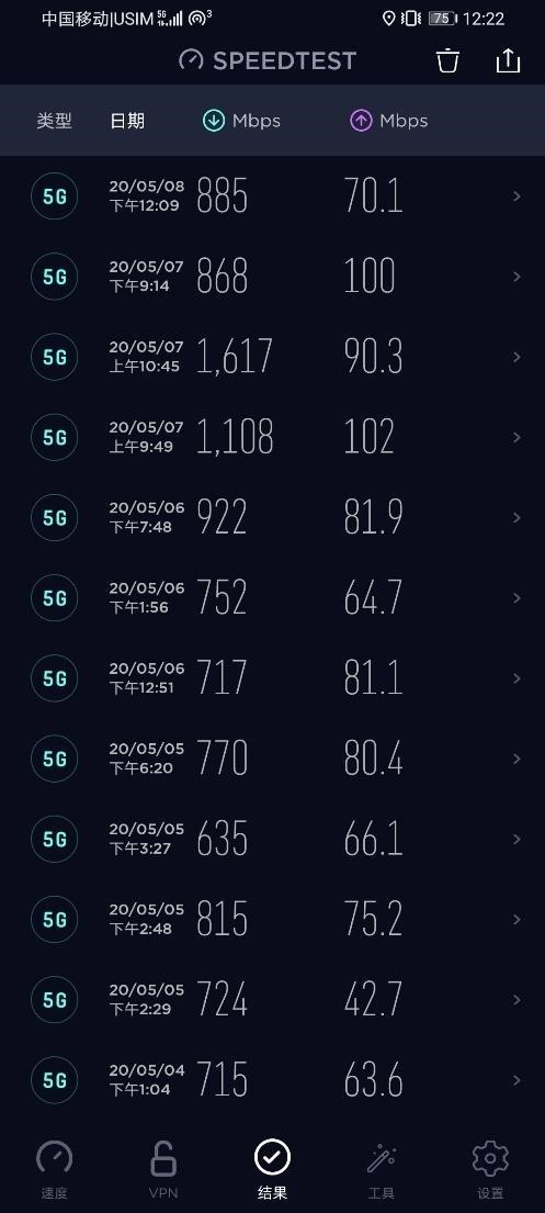 得益于荣耀X10搭载的超级上行技术,结果显示,5800米到6500米高度区间内的X10 5G覆盖良好、稳定,最高下载速度可达1617Mbps,上传速度可达90.3Mbps。