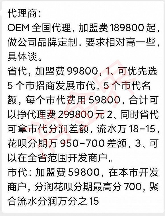 银土科技还向各级代理商表示,OEM、省级代理商可进一步自行发展下线,“收取签约费并参与流水抽成”。