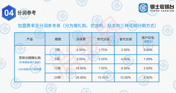 银土科技号称,成为银土省级代理商后,一家商户花呗分期流水比如在1万元左右,代理商可拿到950元分润。