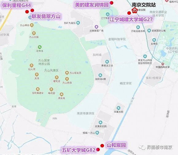 美的建发润锦园项目具体交院站,约1.3公里,步行约20min;距离江宁城建G27地块仅770米,步行约7min。