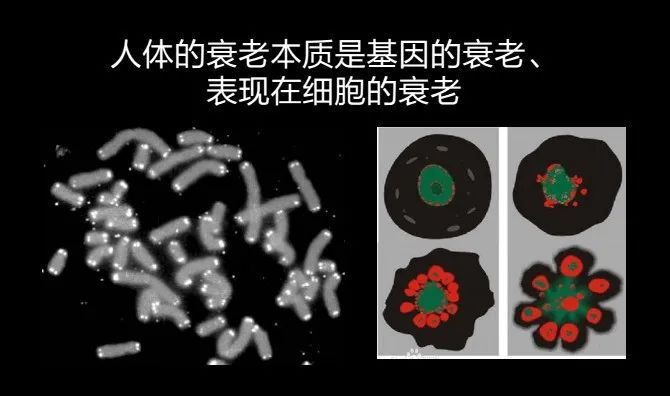 这个过程,从基因学来说就是人类衰老的过程。可以看到,图片右边显示的是一个细胞,细胞中间绿色的是细胞核。如果它的端粒丢失,染色体会不断缩短,细胞核周围形成红色的“凋亡小体”。“凋亡小体”越来越多,细胞的形态随之发生变化。最终,细胞将出现一种异常的状态。整个过程叫做“细胞凋亡”,细胞程序性死亡。
