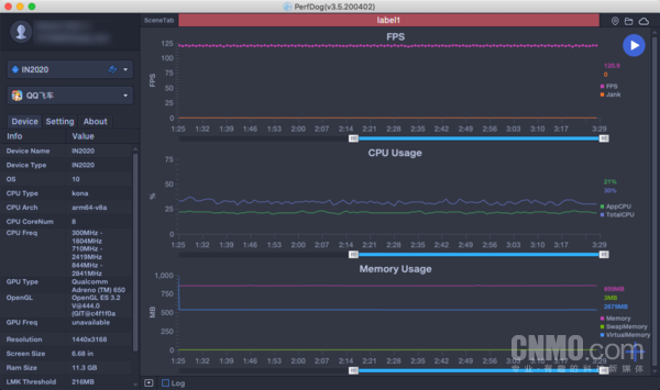 当然,高帧2.0早已深入一加8 Pro的方方面面。除日常使用外,运行游戏等场景同样是120Hz瞳孔屏发挥实力的舞台。经过我们的实测,运行《QQ飞车》时一加8 Pro可以长期维持在120fps,不会出现波动,相比其他游戏最高仅为60fps来说,这样的表现能带来更加细腻流畅的画面。