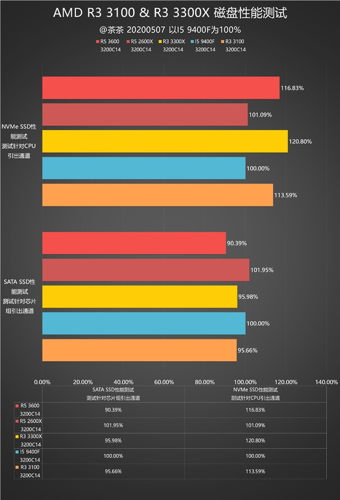 在磁盘性能上,没有太大的特别之处,AMD在NVMe上有优势,INTEL在SATA上有优势。不过R3 3300X的NVMe性能比较扎眼,甚至超过了R5 3600。