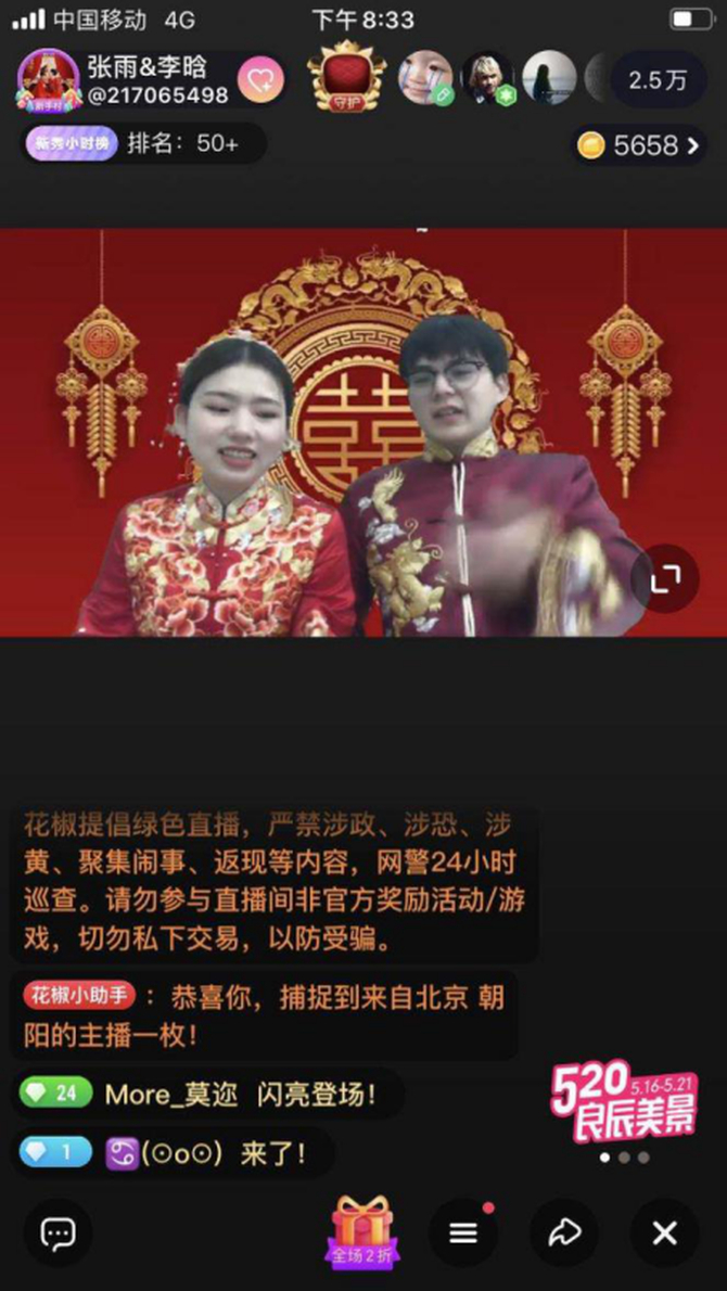 在520这天,新人、亲友、网友们联手在直播镜头前完成了一场关于爱情的盛宴。