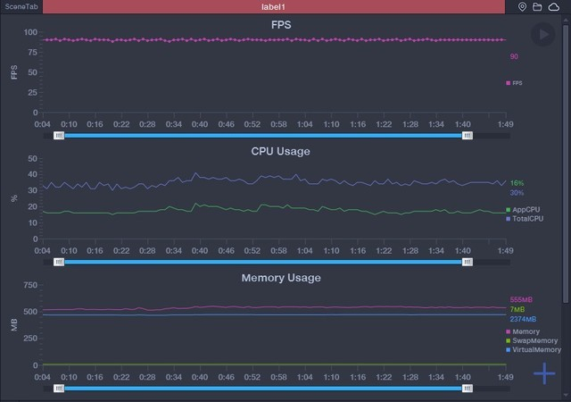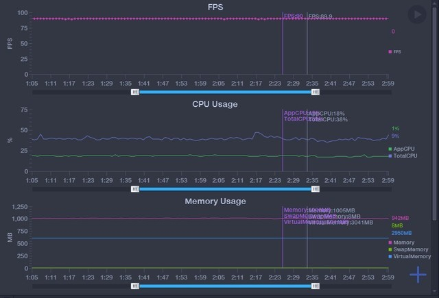 值得一提的是,《王牌战士》进行了更加深入的适配,只有当游戏进行时才会以满帧90帧运行,角色死亡、游戏加载动画时帧数会有所下降。从CPU负载可以看到,在角色死亡时,负载也会有所下降,所以可以推测这种帧数的下降是为了在不影响游戏体验的情况下尽可能的降低发热和功耗。